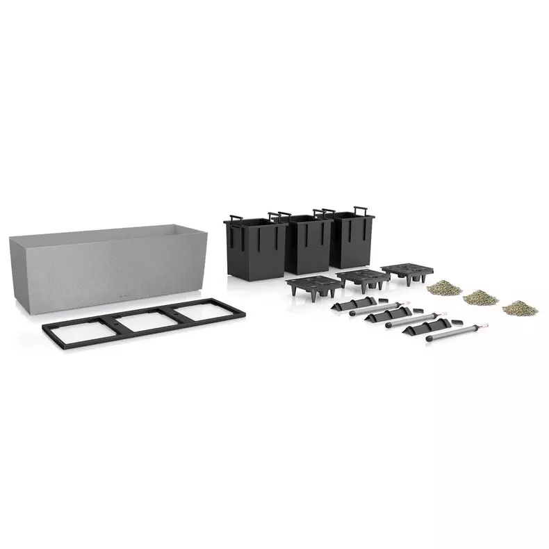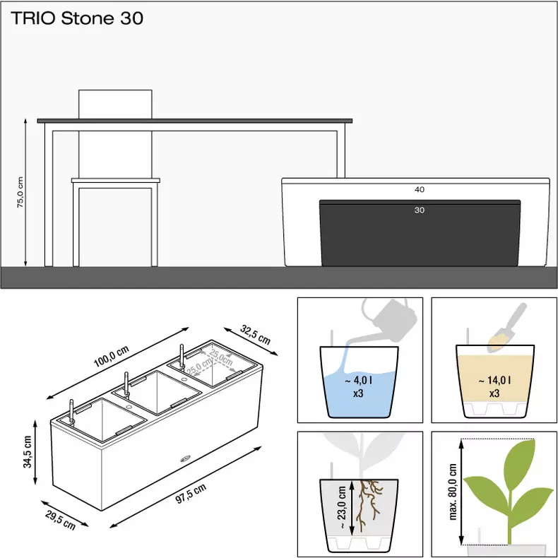 For gardens, terraces or larger balconies, TRIO Stone can be used as a decorative half-height green privacy screen or mini flowerbed. Thanks to its versatility, TRIO can easily be combined with the matching trellis for climbing plants to create green walls or with the additionally available pedestal as a raised bed. Planting with small espalier fruit trees, tomato plants or branching vines creates a green privacy screen, which not only looks beautiful but also ensures your own delicious harvest. The perfect combination for an enjoyable time outdoors!