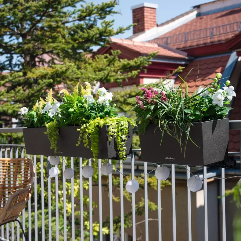 The BALCONERA Stone is made of high-quality, weatherproof plastic and is therefore robust and durable. The original LECHUZA irrigation system is integrated into the planter, which supplies your balcony plants with a sufficient amount of water even on hot days. Frequent watering is no longer necessary, leaving you more time to relax and unwind in your new favorite outdoor spot. Excess irrigation or rainwater can drain away by removing the overflow screw on the underside of the planter. If you want to change the plants in the BALCONERA Stone, you can easily do so with the removable plant inserts with retractable handles and then put them back into the already assembled boxes. BALCONERA Stone has a removable plant insert in sizes 40 and 50, and two plant inserts in sizes 80 and 100, which can be planted individually. These can also be exchanged as desired, because the inserts of BALCONERA 40 fit into BALCONERA 80, and the inserts of BALCONERA 50 fit into BALCONERA 100.