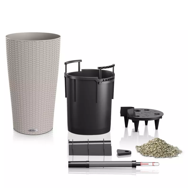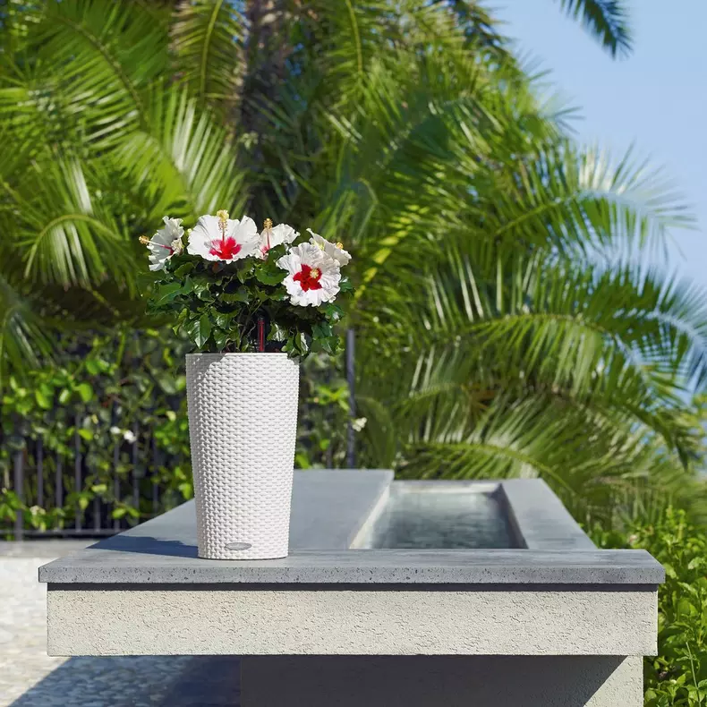 The classic colours such as white or granite present the lush green of the houseplants in a modern and timeless way. The woven look in mocha or sand brown emphasises a natural aesthetic. The column shape brings plants to eye level and sets them artistically in the scene.