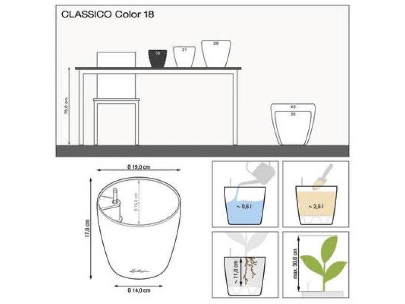 Baby plants, cuttings and other small plants find their place in the CLASSICO Color and are supplied with exactly the right amount of water via the integrated irrigation system. The container is equipped with a separating bottom, water reservoir and water level indicator, which helps to prevent waterlogging. The included LECHUZA-PON planting substrate serves as a drainage layer. This makes the CLASSICO Coloir a versatile classic that is both flexible and practical.